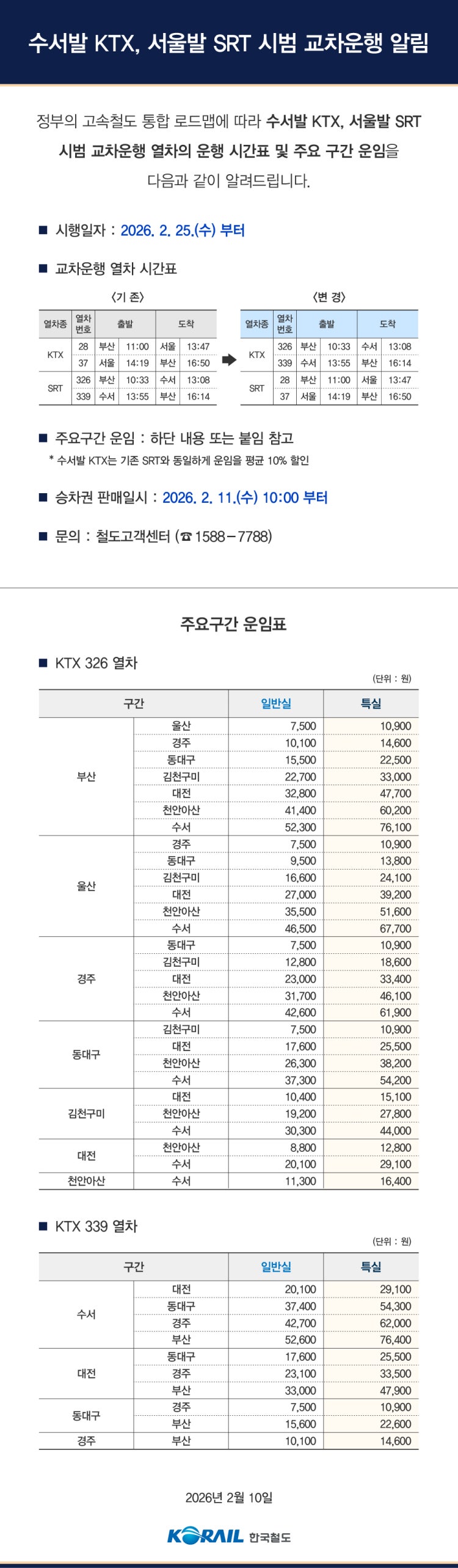 원래 서울역은 한국철도공사의 KTX, 수서역은 SR의 SRT가 운행했지만, 양사 통합을 앞두고 KTX를 수서역에서 착/발하고, SRT를 서울역에서 착/발하는 시범 교차운행이 2026년 2월 25일(수)부터 예정돼 있습니다.